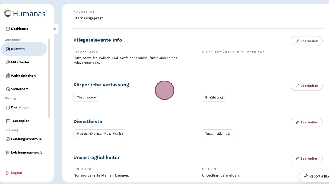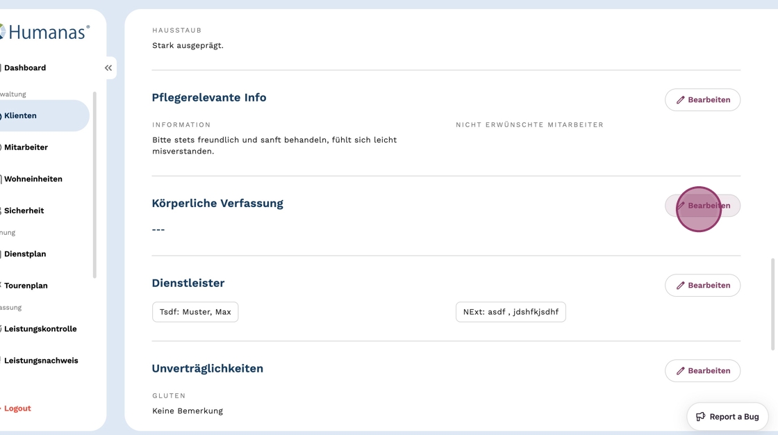 6. Die aktuelle und vollständige Liste zur körperlichen Verfassung des Klienten wird in den "Stammdaten" unter "Körperliche Verfassung" aufgeführt.