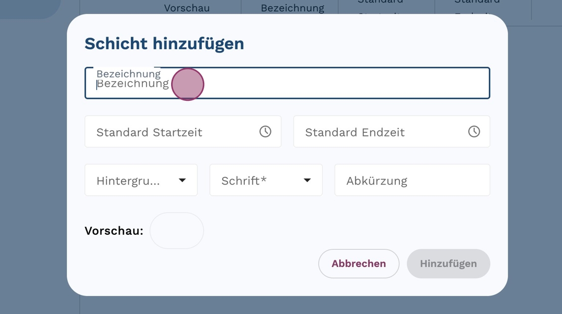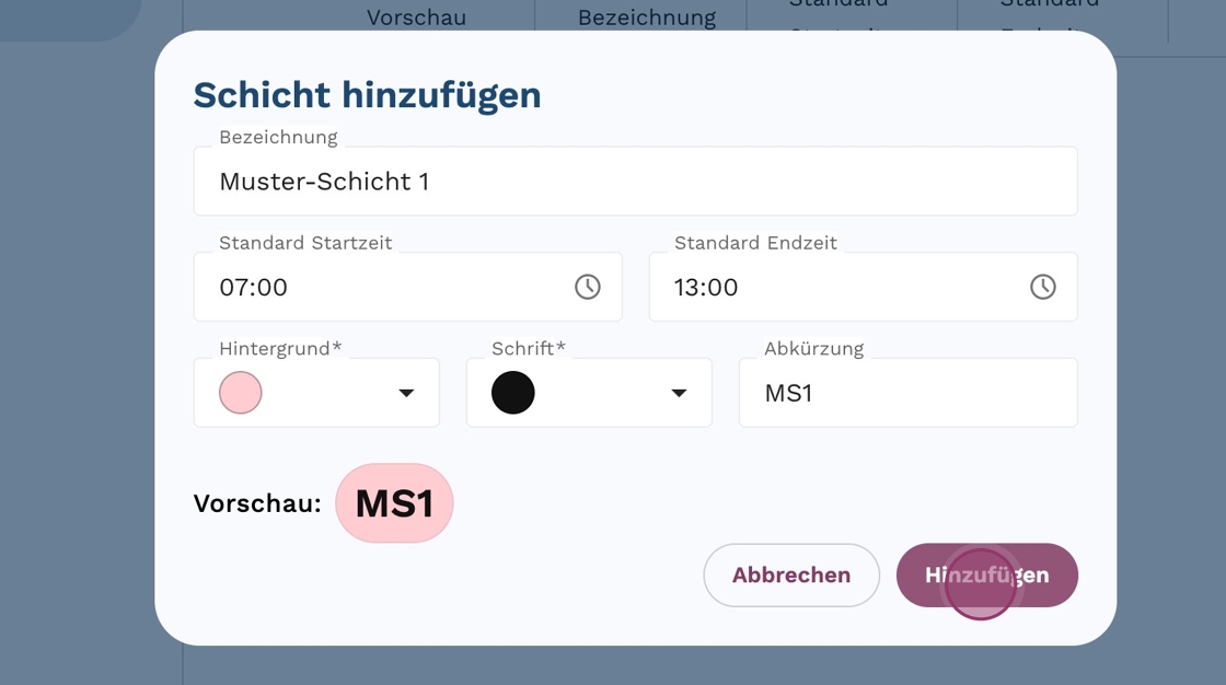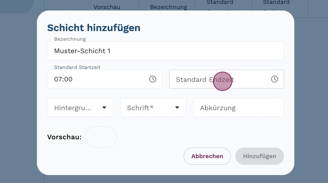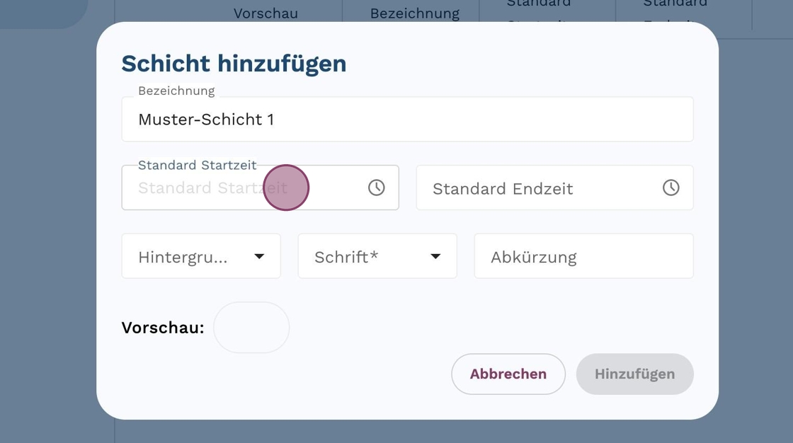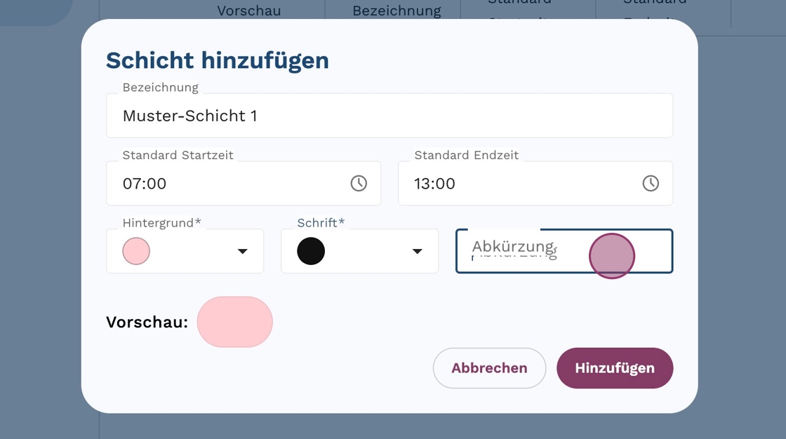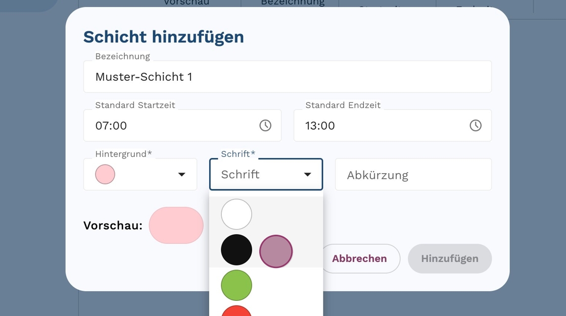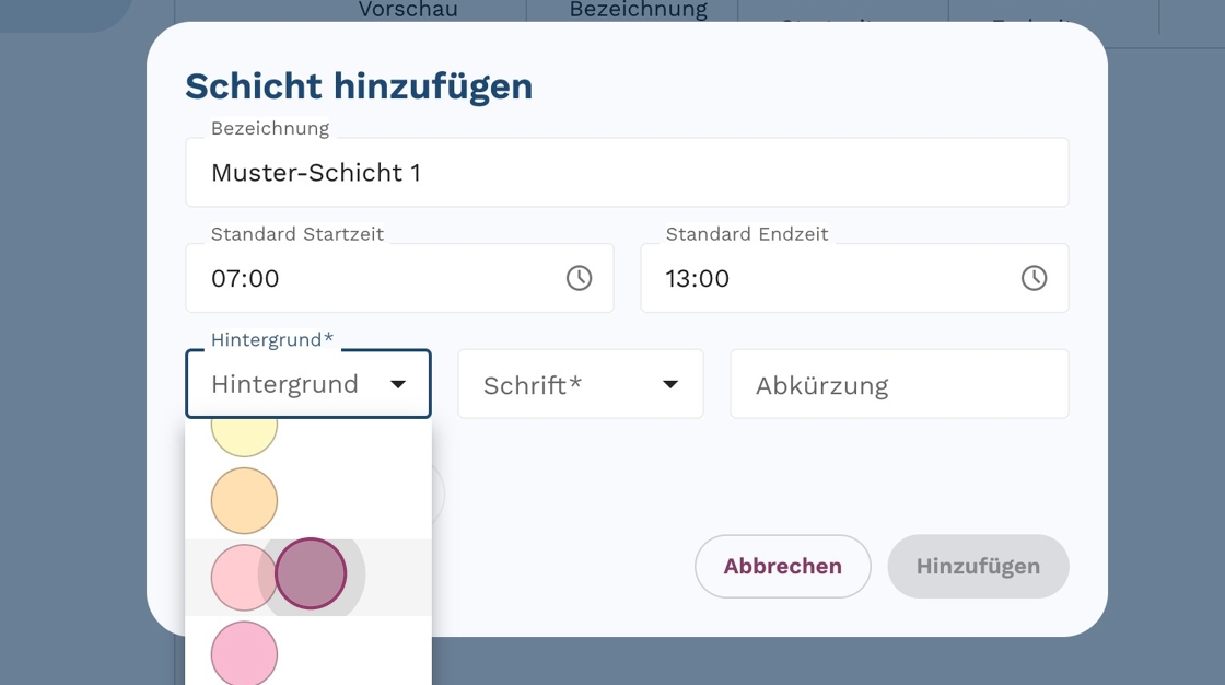 Anmerkung: Die ausgewählte Hintergrundfarbe bestimmt die Anzeige im Schichtplan.