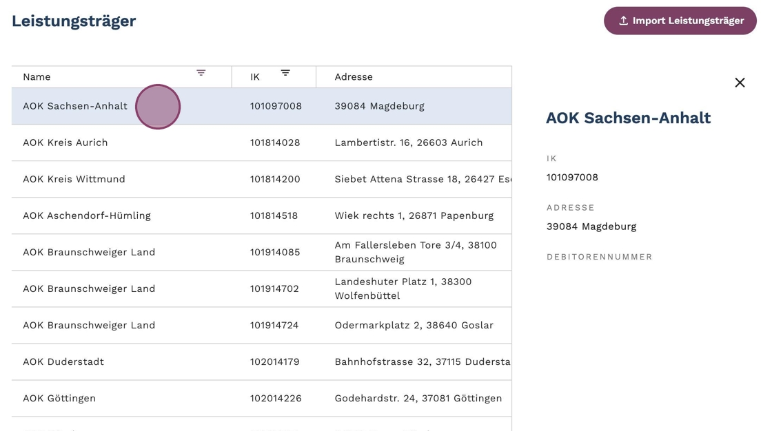 5. Klicke auf den gewünschten Leistungsträger, um dessen Akte zu öffnen. Hier findest Du die IK-Nummer, die Adresse und die Debitorennummer des Leistungsträgers.