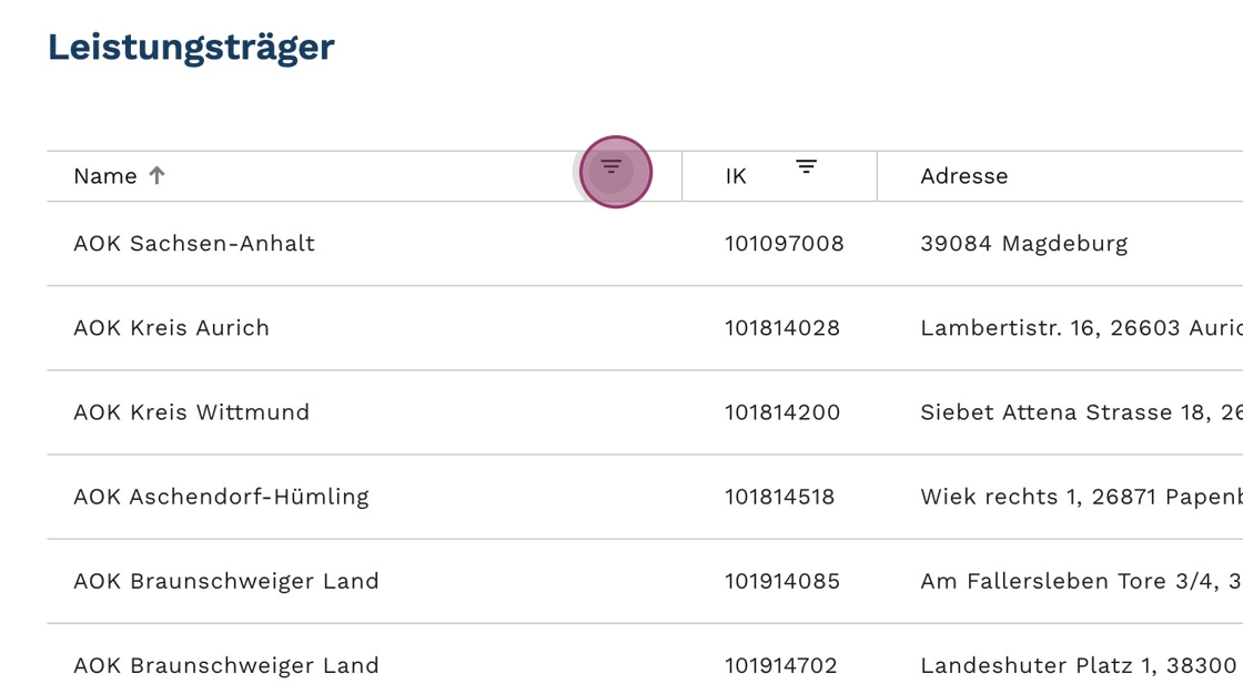 3. Gib den Namen des Leistungsträgers in das Suchfeld ein. Klicke dann auf "Filter".