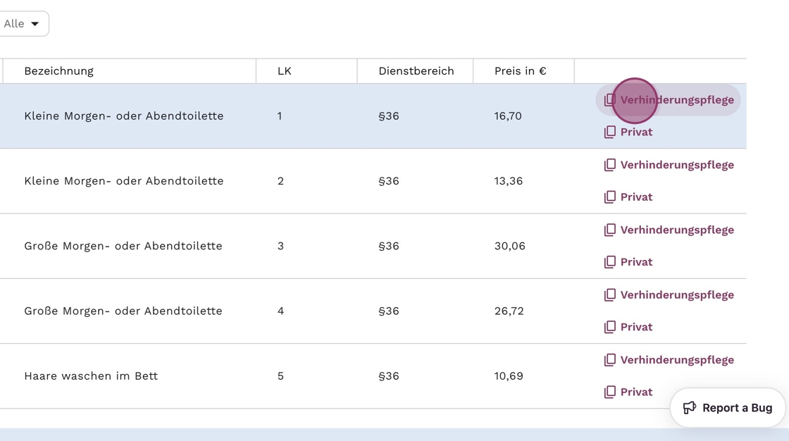 2. Wähle die Leistung aus, die Du bearbeiten möchtest. Wähle "Verhinderungspflege" oder "Privat" und klicke darauf.