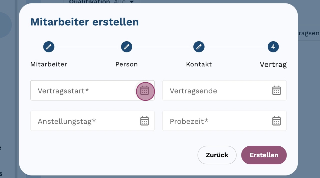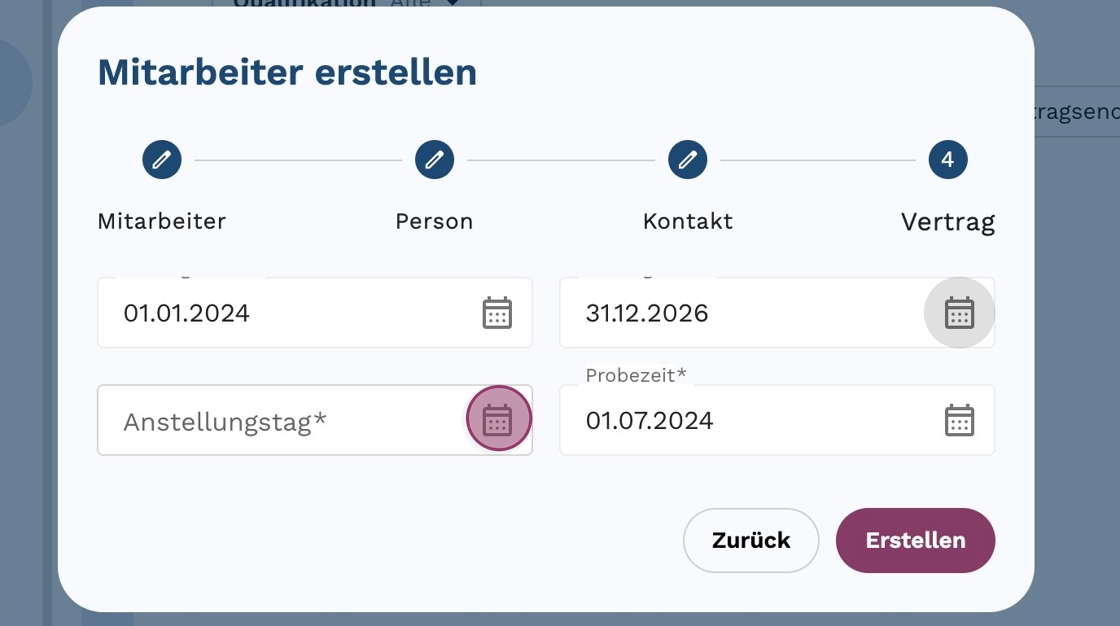 22. Klicke auf das rechte Kalendersymbol, um den "Anstellungstag" auswählen. Die "Probezeit" wird automatisch generiert.