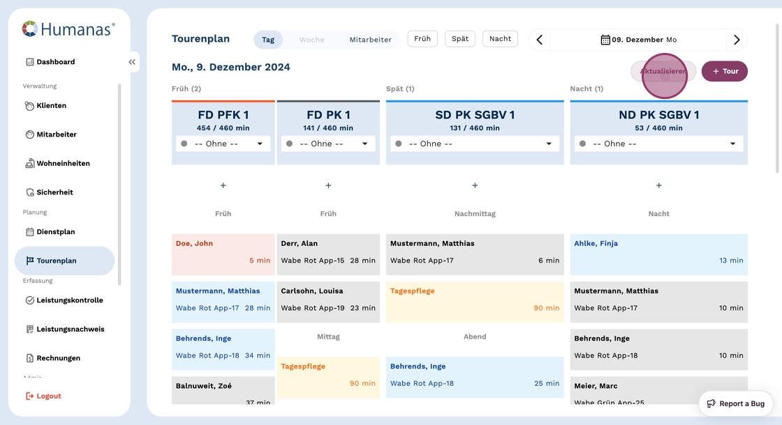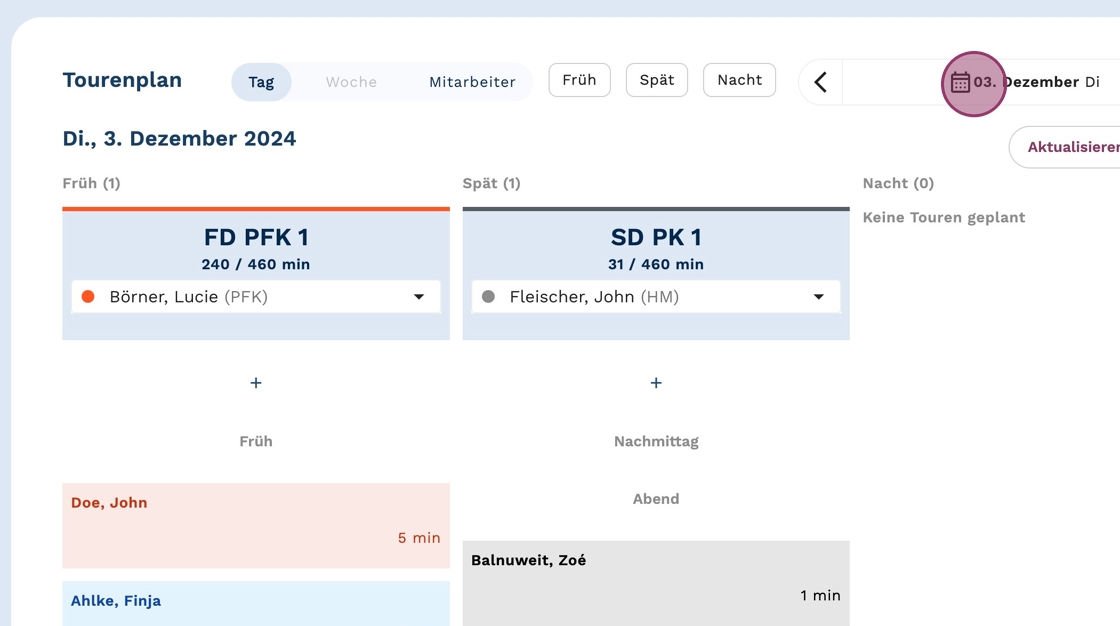 4. Klicke auf "Aktualisieren", um die Tour für das gewünschte Datum angezeigt zu bekommen.