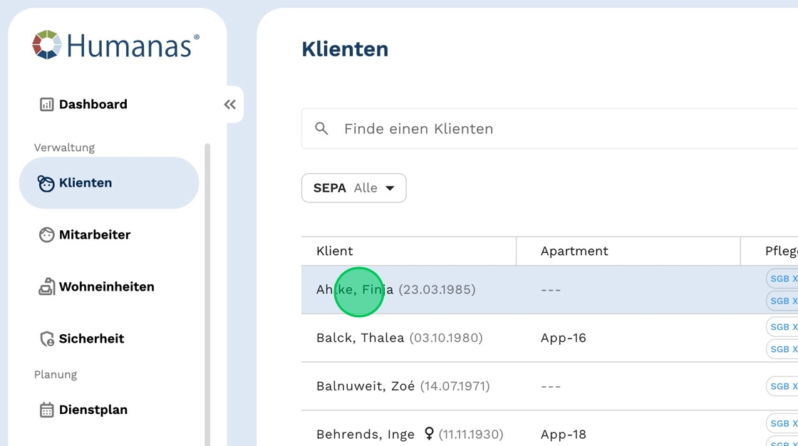7. Scrolle die Liste nach unten und wähle "Soziale Betreuung" aus.