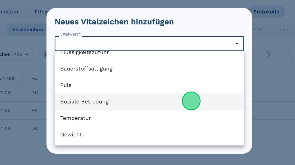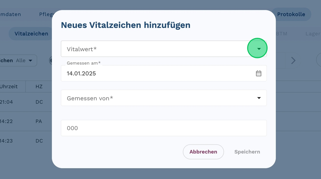 6. Klicke auf den kleinen Pfeil rechts im Feld "Vitalwert", um die Art des Vitalzeichens auszuwählen.