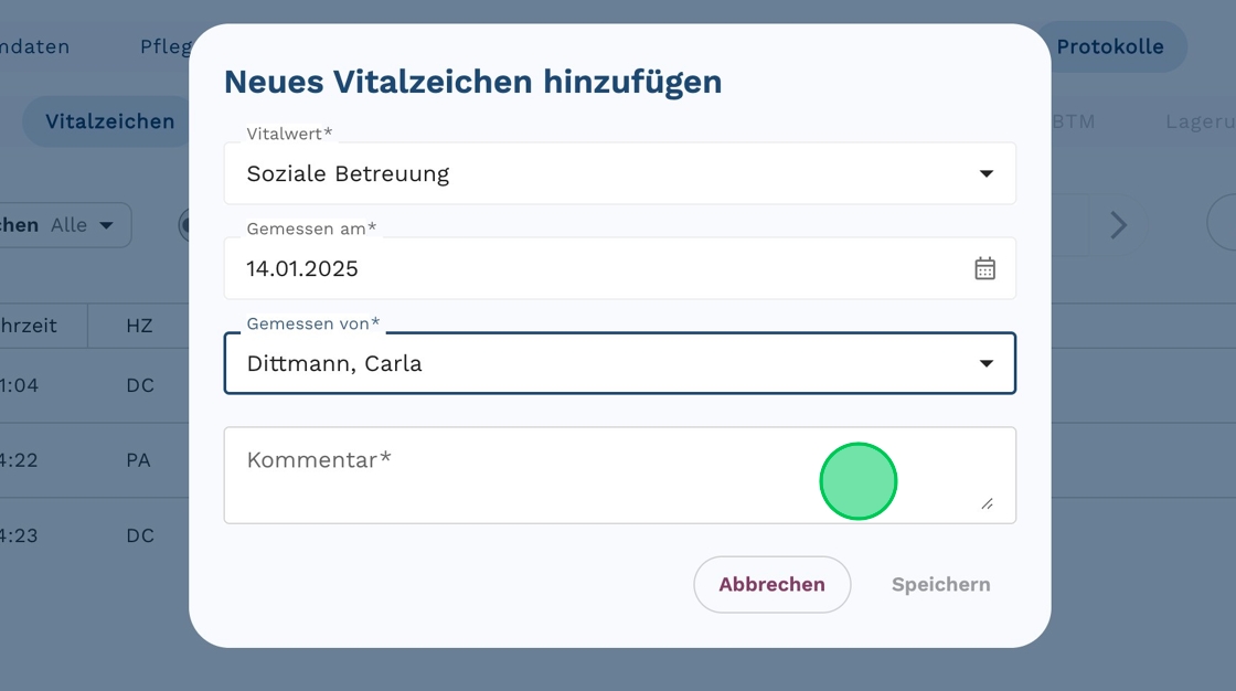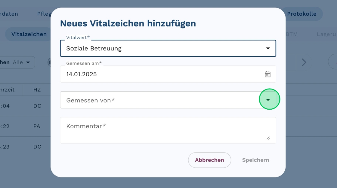 Klicke dann auf den kleinen Pfeil rechts im Feld "Gemessen von" und wähle den Namen der Pflegekraft aus, die die Messung durchgeführt hat.