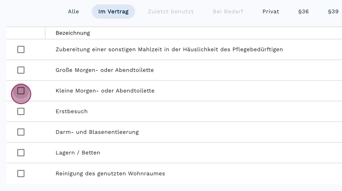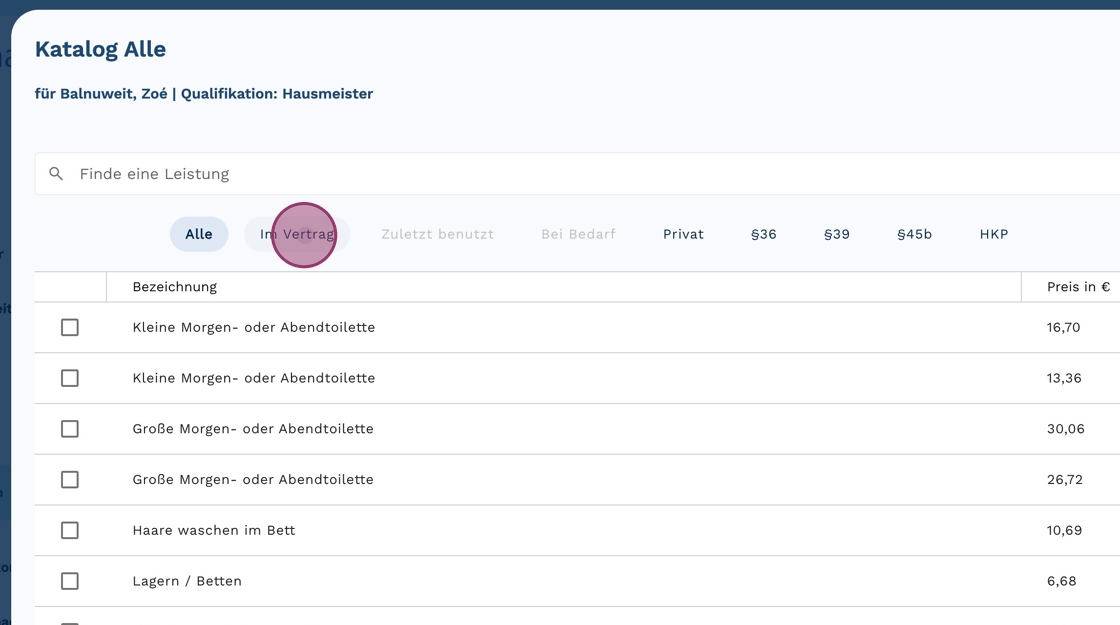 8. Klicke auf "Im Vertrag", um aus den vertraglich vereinbarten Leistungen auszuwählen, oder bleibe bei "Alle", um aus dem gesamten Leistungskatalog auszuwählen.