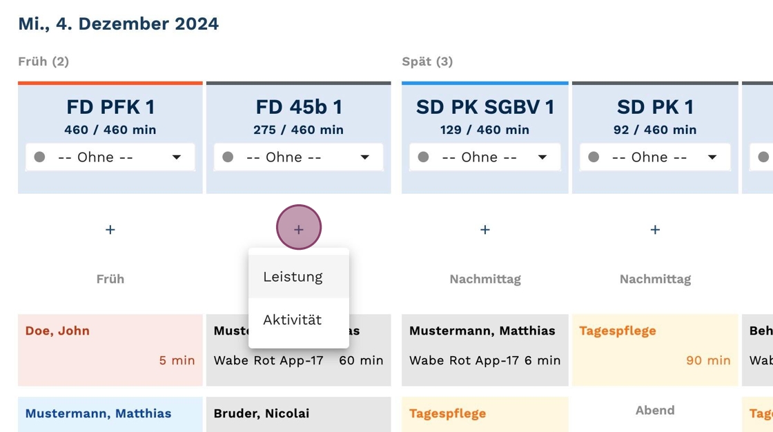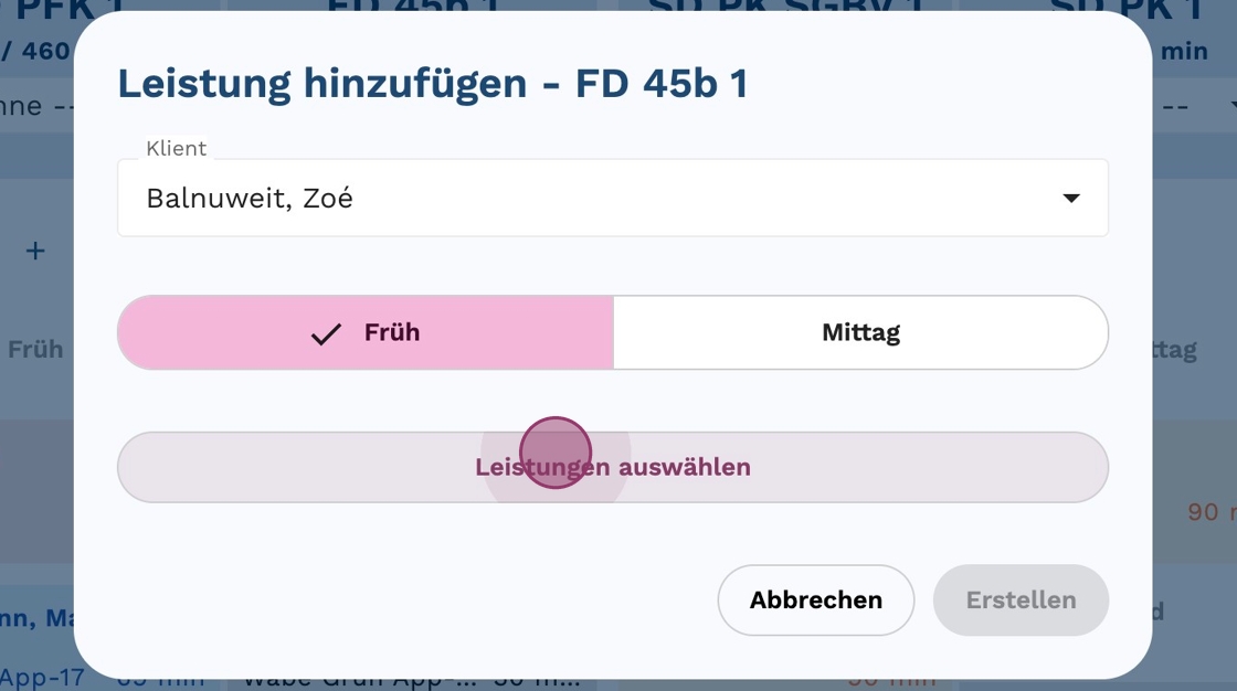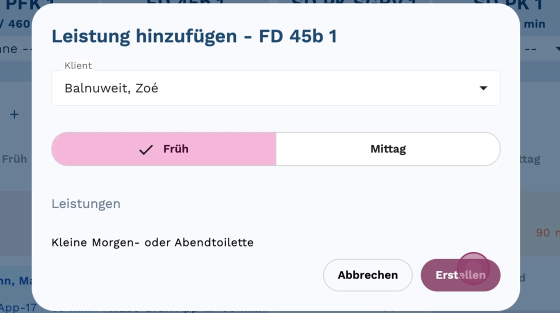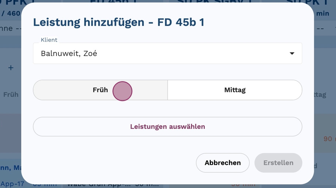 6. Wähle zwischen "Früh" oder "Mittag", abhängig davon, zu welcher Zeit die Leistung (oder Aktivität) erbracht werden soll.
