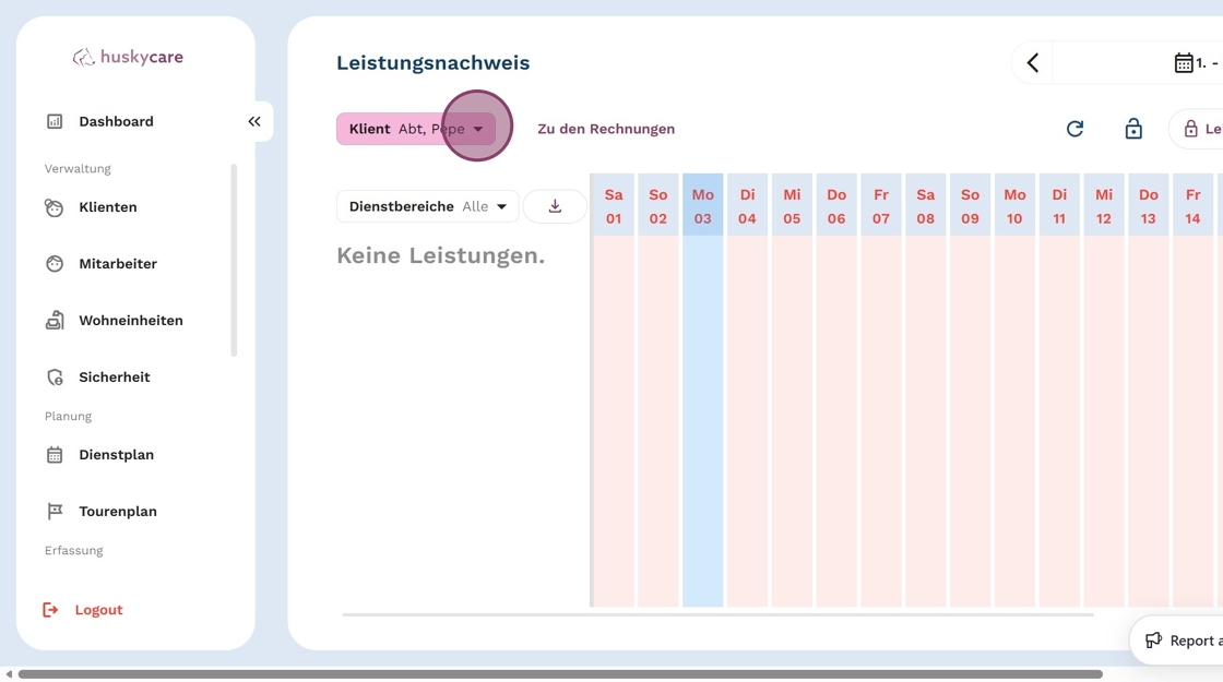 2. Klicke auf das rot markierte Auswahlmenu Klient