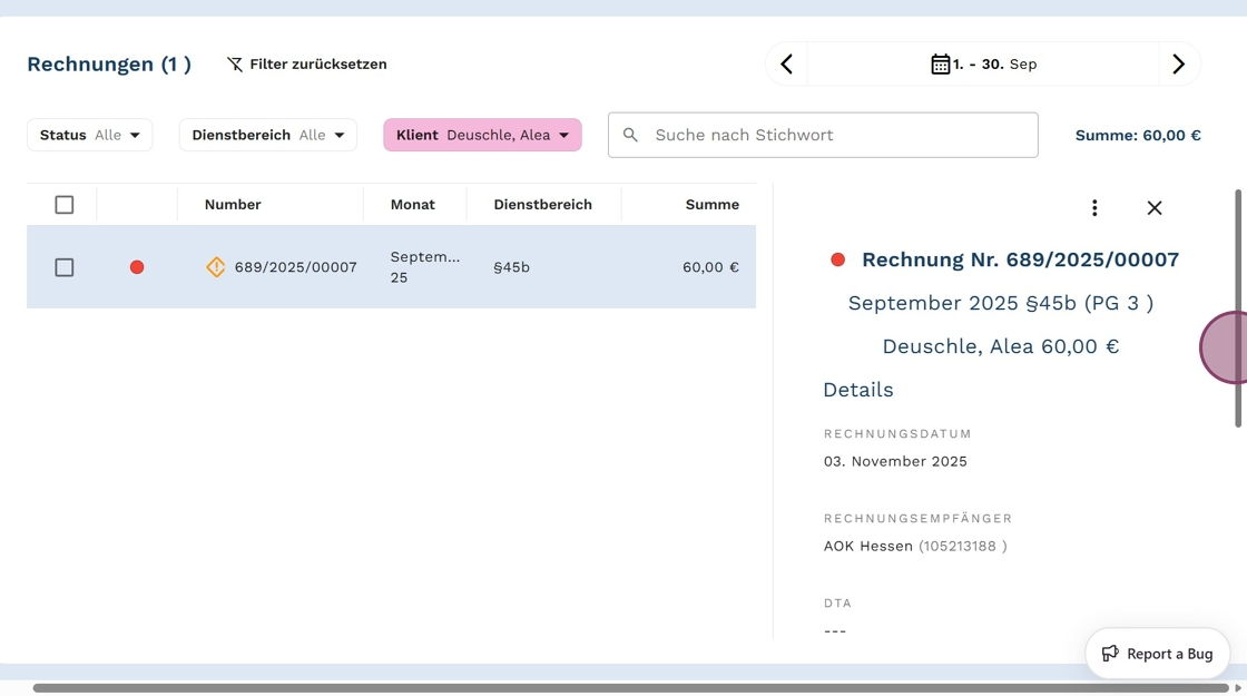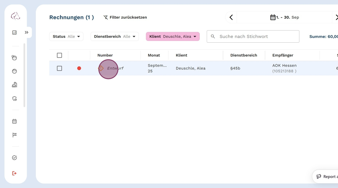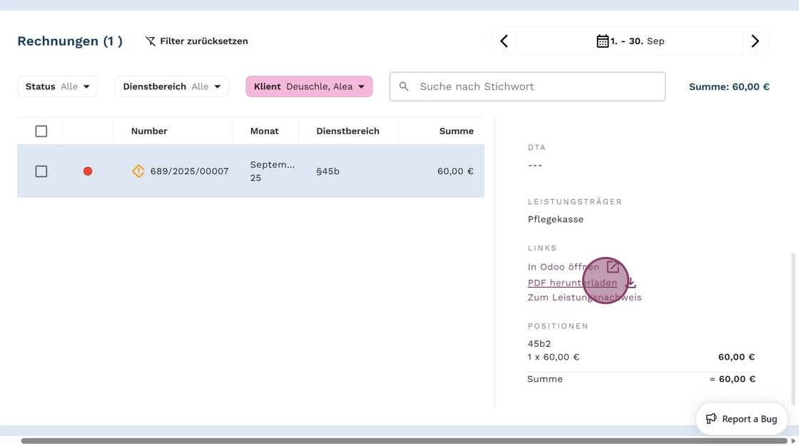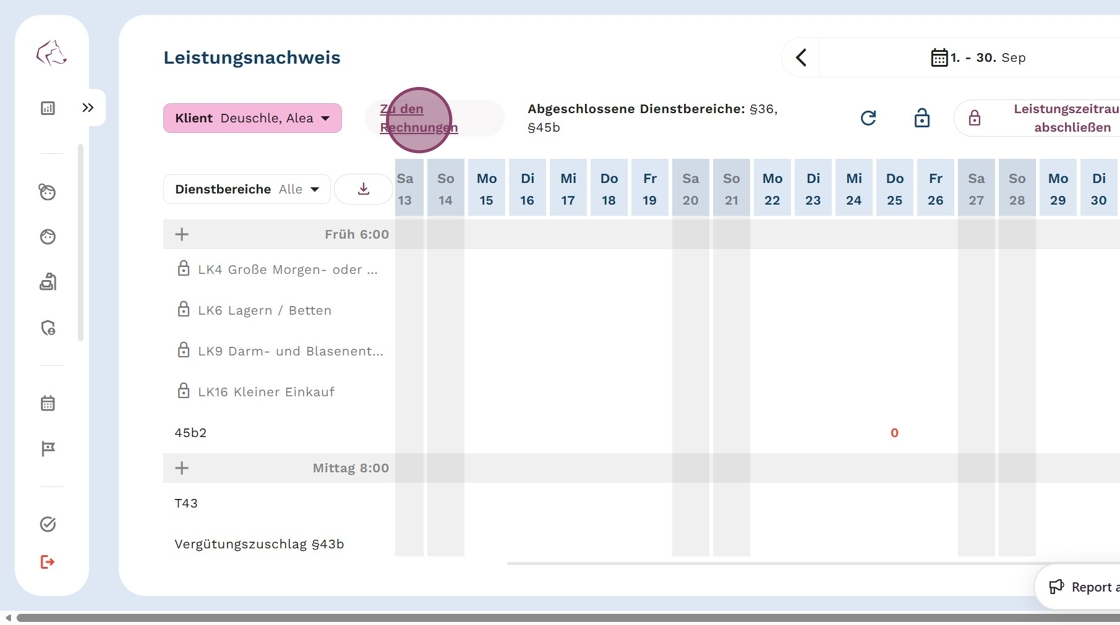 11. Sobald du auf „Leistungszeitraum abschließen“ klickst, wird automatisch ein Rechnungsentwurf erstellt. Um den Rechnungsentwurf oder bereits erstellte Rechnungen einzusehen, klicke anschließend auf den rot markierten Reiter „Zu den Rechnungen“.