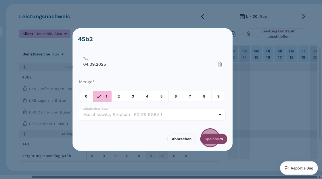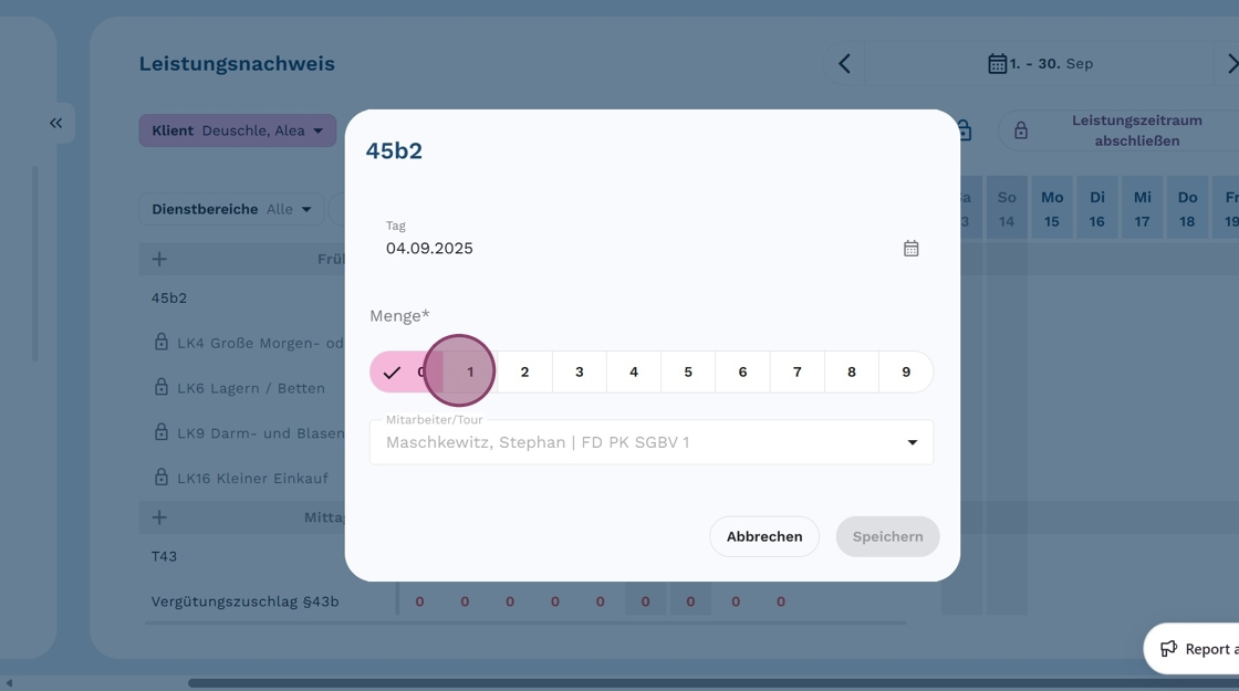 8. Unter dem Feld mit der Menge werden der Mitarbeiter und die Tour angezeigt , der an dem jeweiligen Tag die Leistung ausgeführt hatte. Klicke bitte auf Speichern damit deine Korrektur gespeichert wird.