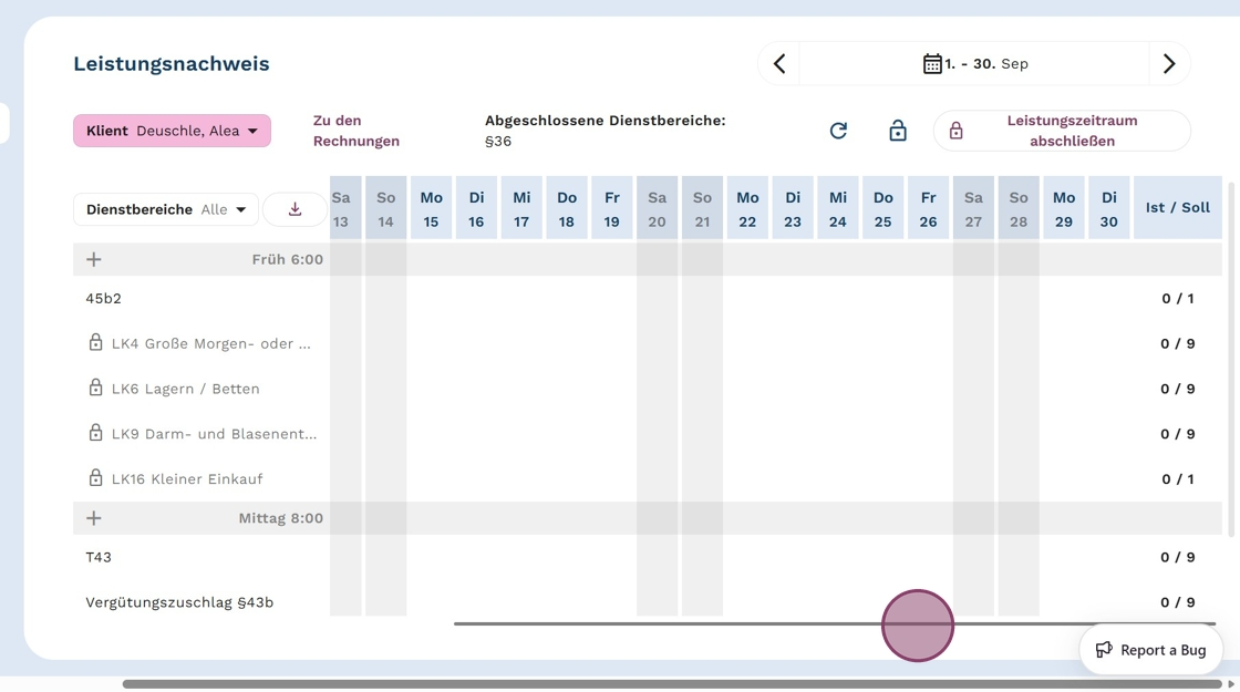 5. Dann werden alle geplanten und ausgeführten Leistungen auf Monatsbasis angezeigt. Wenn du nach rechts navigierst, siehst du den IST/SOLL Stand, da kannst du leicht erkennen, ob es Abweichungen gibt.