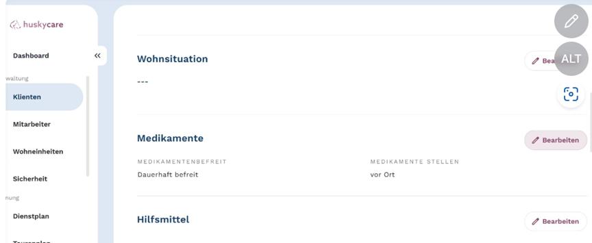 9. Die aktuelle und vollständige Übersicht zum Umgang mit den Medikamenten des Klienten wird in den "Stammdaten" unter "Medikamente" aufgeführt.
