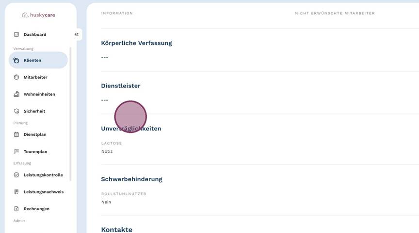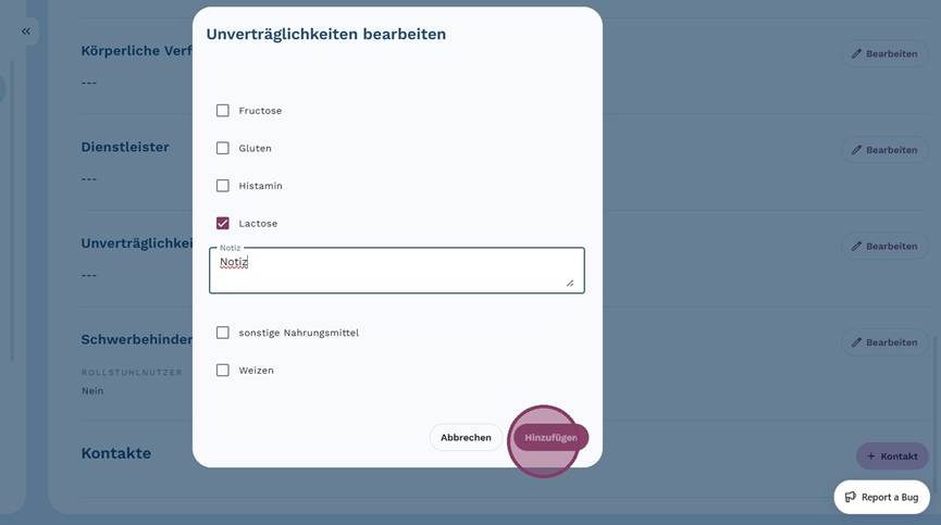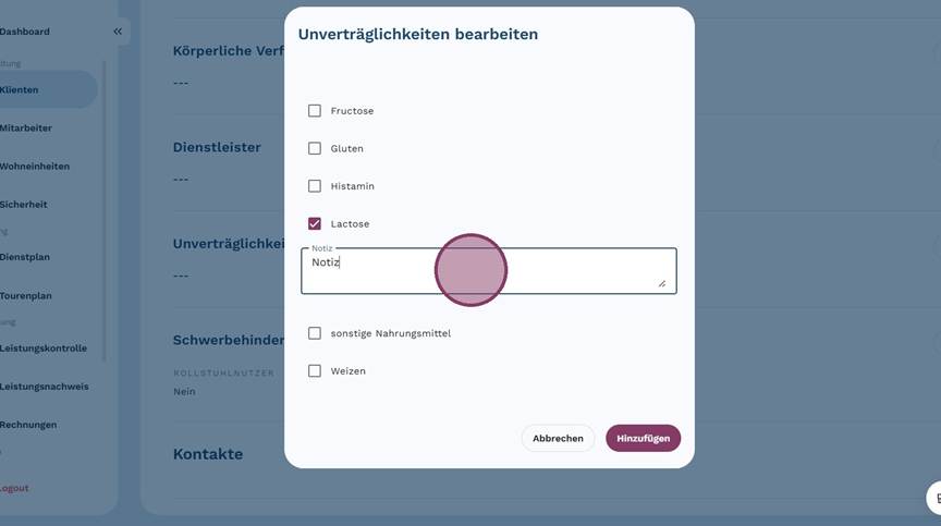 4. Wähle die auf den Klienten zutreffenden Unverträglichkeiten aus.