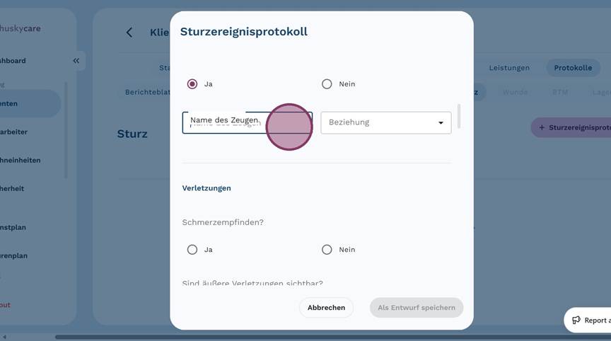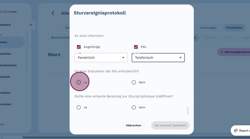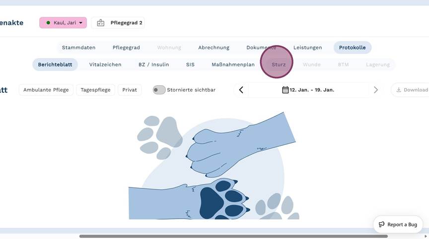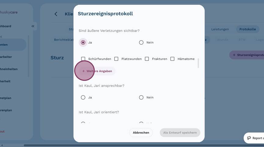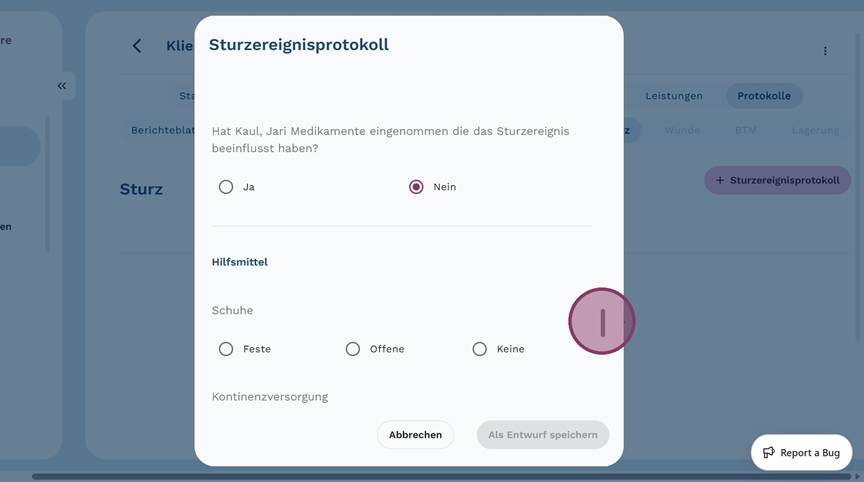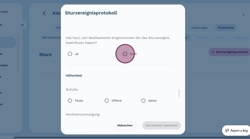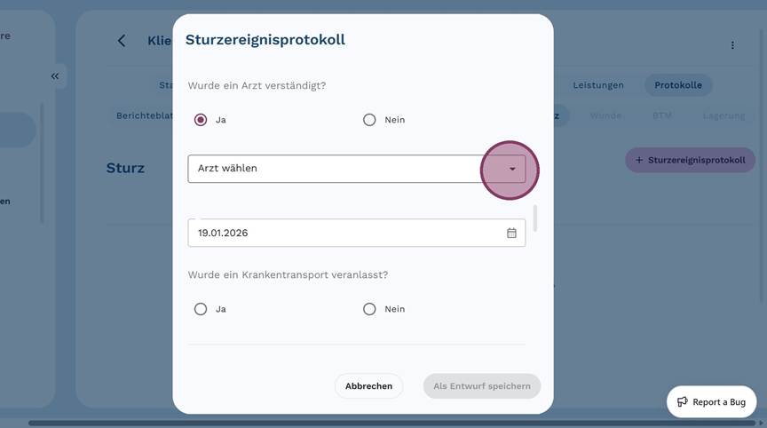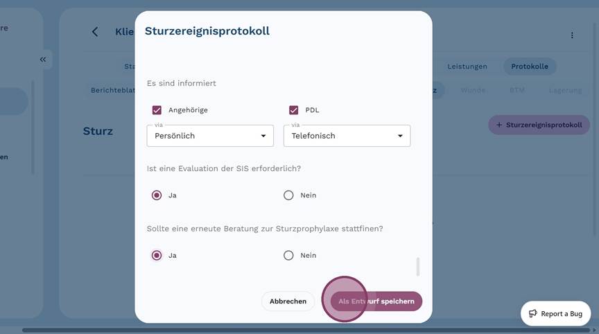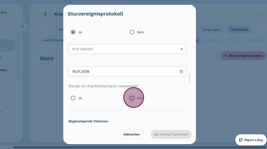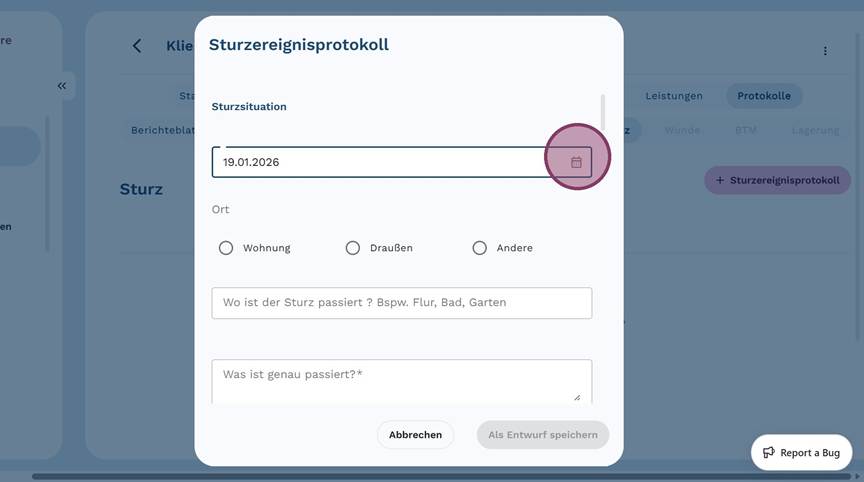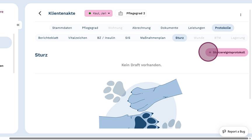 5. Klicke auf "+ Sturzereignisprotokoll", um ein neues Protokoll anzulegen