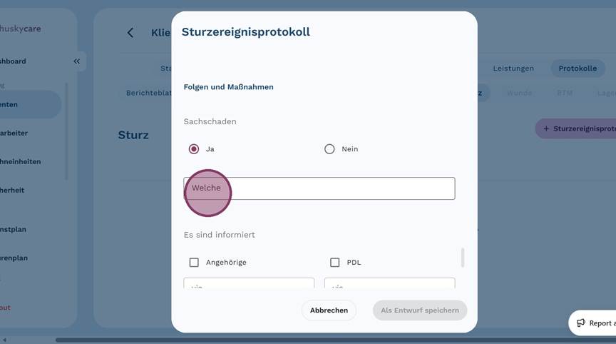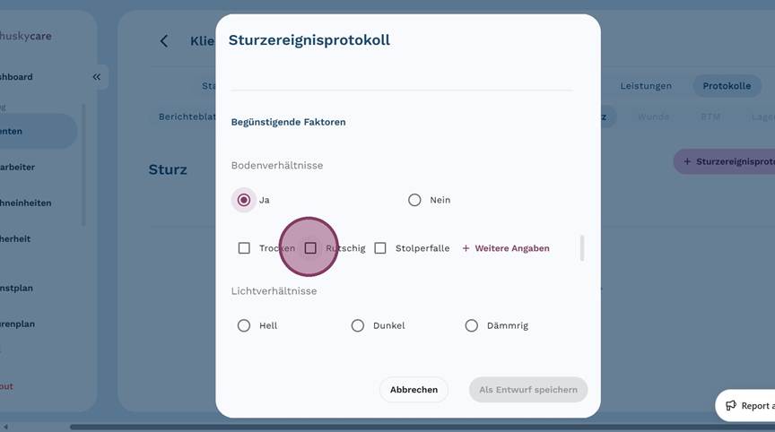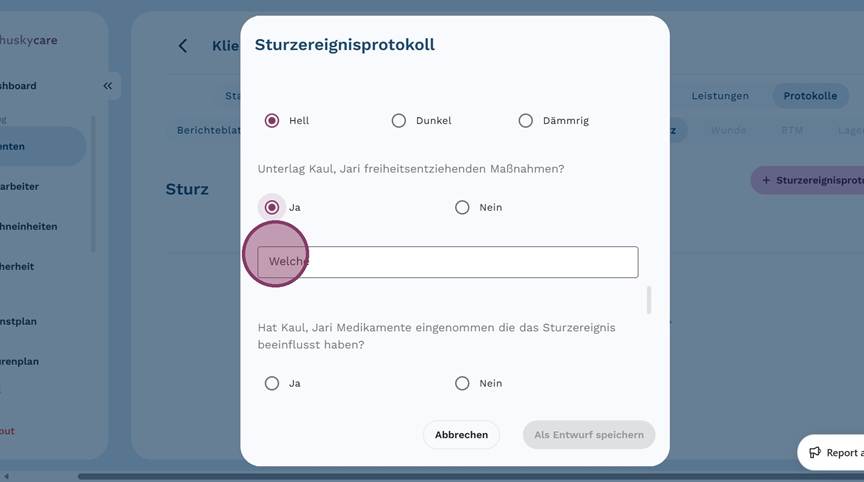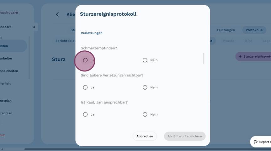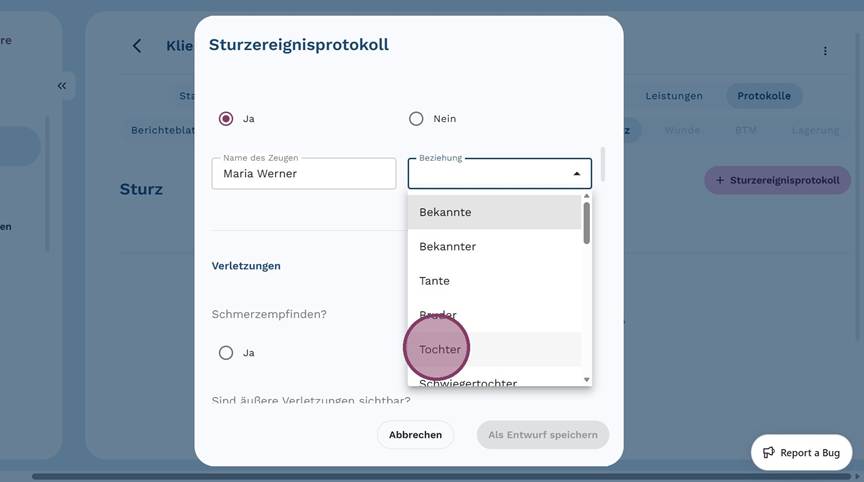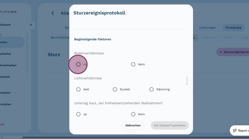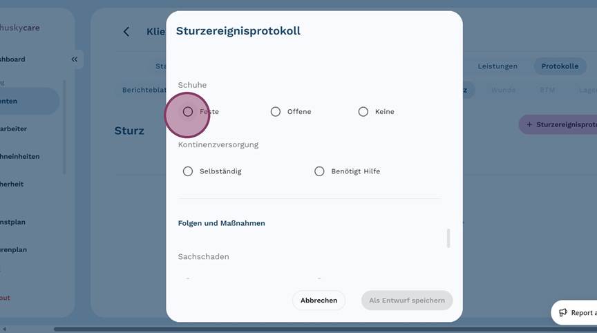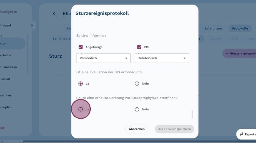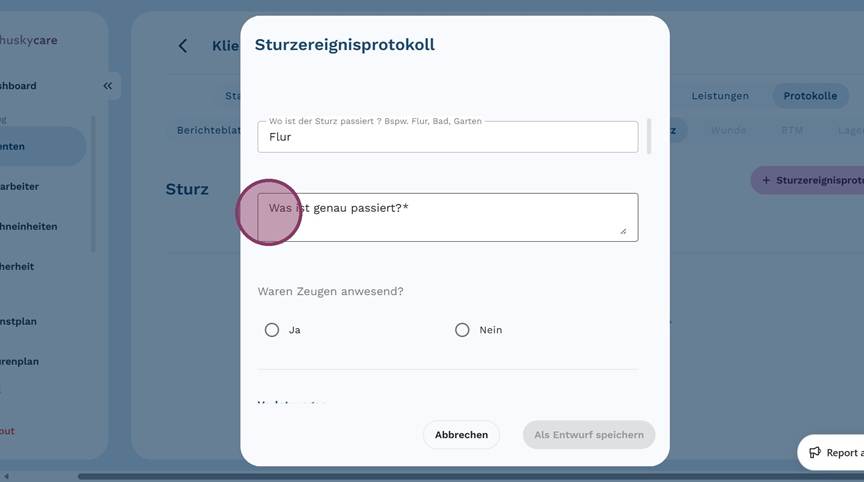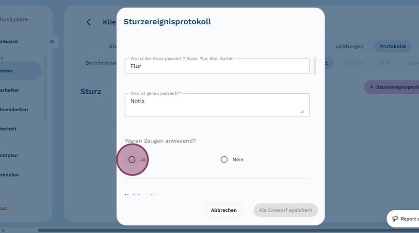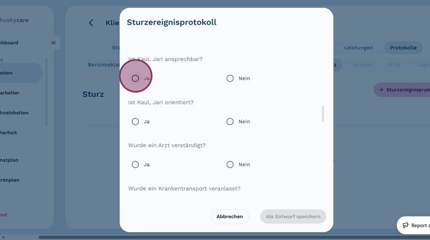 5. Klicke auf "+ Sturzereignisprotokoll", um ein neues Protokoll anzulegen
