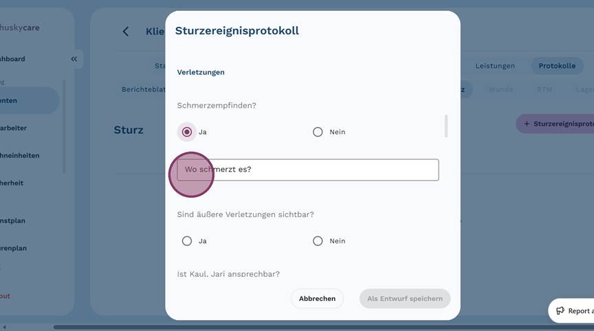 13. Beantworte die Frage nach dem "Schmerzempfinden?". Wenn die Antwort "Ja" lautet, fülle das Feld "Wo schmerzt es?" so detailliert wie möglich aus.