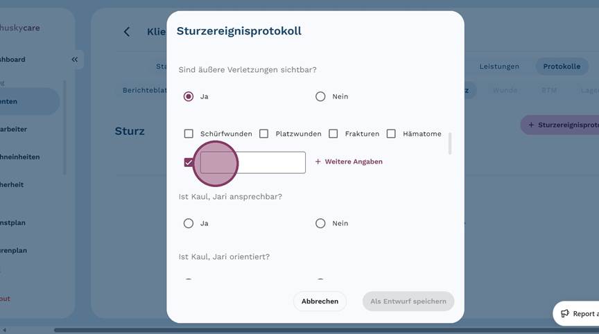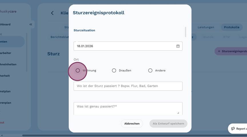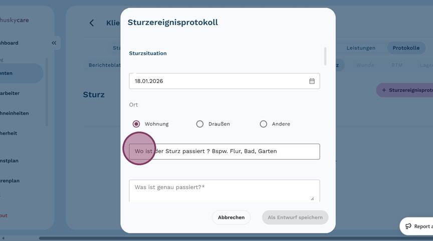 9. Fülle das Feld "Wo ist der Sturz passiert?" aus, um den Ort des Sturzes so genau wie möglich zu beschreiben.