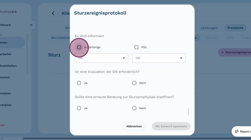 29. Falls ein Angehöriger oder PDL informiert wurde, klicke auf die entsprechenden Felder und gib an, auf welchem Weg die Kontaktaufnahme stattfand.